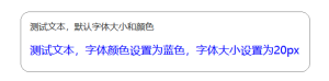 <p style="color:blue;font-size: 20px;">测试文本,字体颜色设置为蓝色,字体大小设置为20px</p>